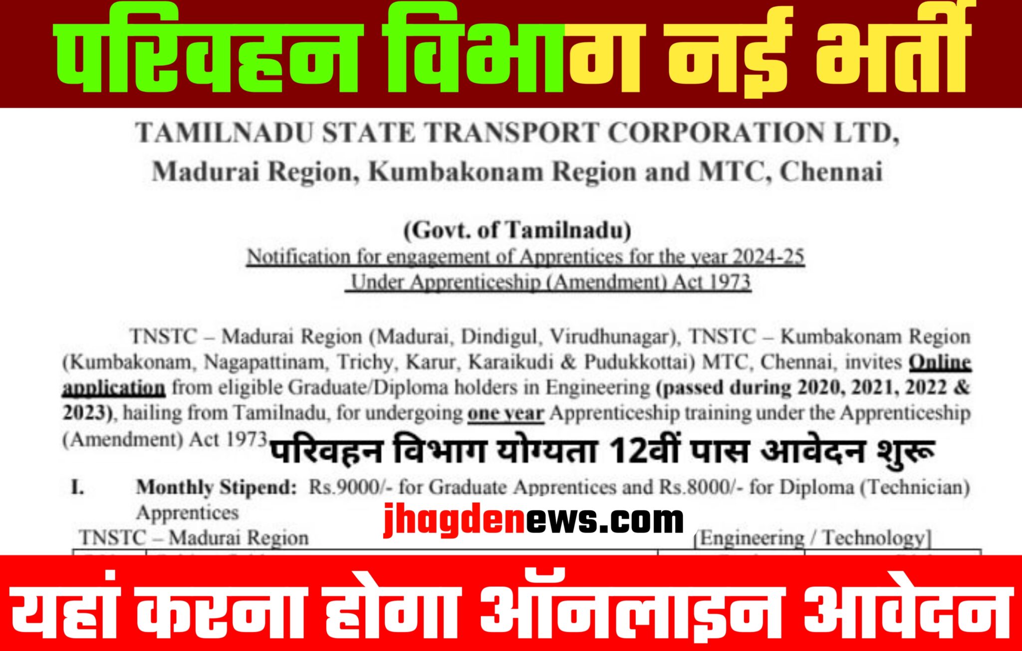Transport Department Vacancy 2024 : हम सभी स्टूडेंट लोगों को जानकारी बताना चाहेंगे कि संस्थान तमिलनाडु राज्य परिवहन निगम लिमिटेड की तरफ से ट्रांसपोर्ट डिपार्टमेंट वैकेंसी 2024 का सूचना को रिलीज कर दिया गया है तो अगर आप लोग भी ट्रांसपोर्ट डिपार्टमेंट वैकेंसी 2024 में आवेदन करने के लिए सोच रहे हैं तो इस आर्टिकल पर अंत तक बने रहिए।